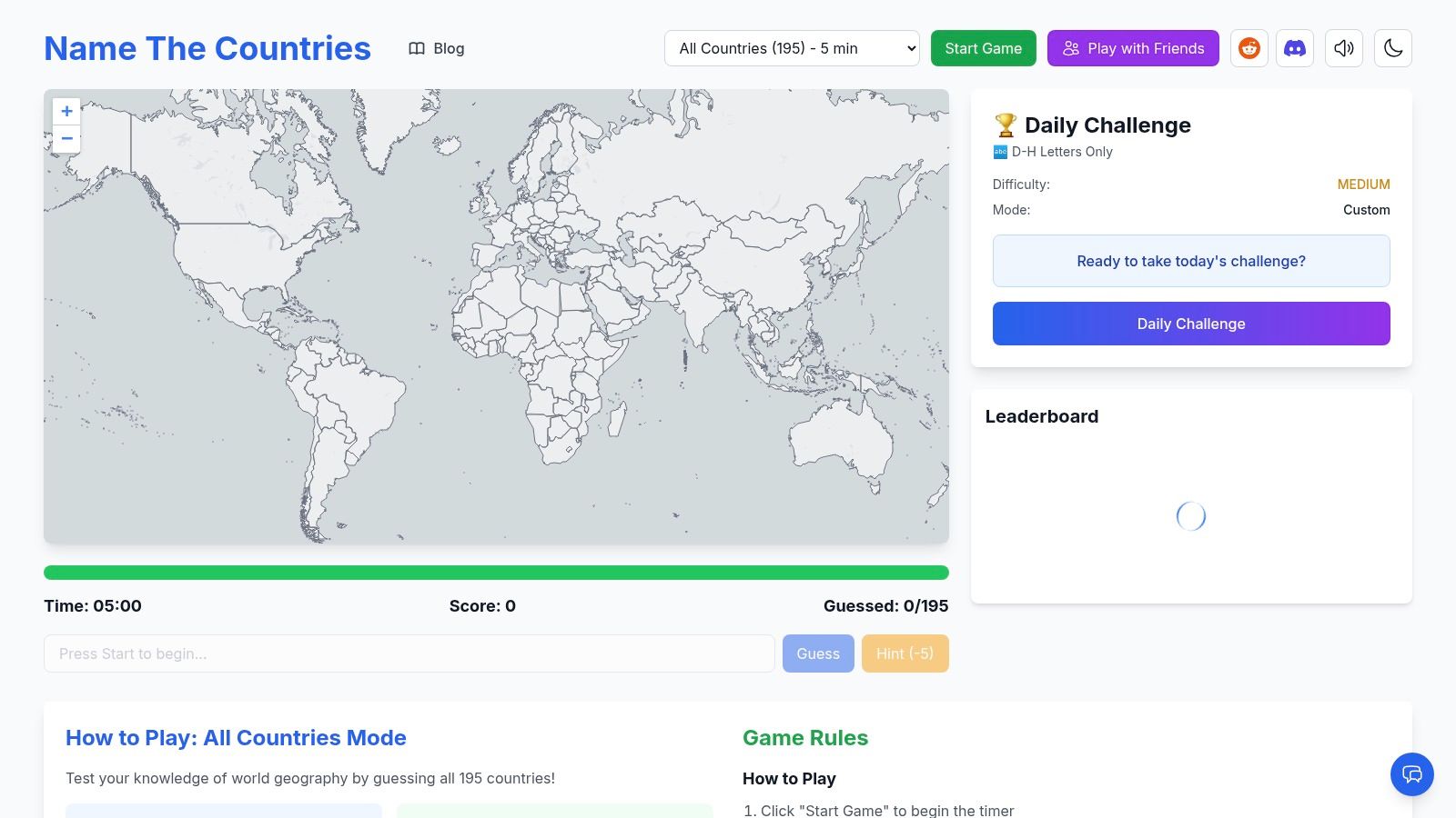 Name The Countries excels as a free online world geography quiz game, ideal for students, educators, and casual gamers alike. Its diverse game modes cater to various learning styles and time constraints. From quick continent-specific quizzes to the intense five-minute "All Countries" marathon, there's a challenge for everyone. The Daily Challenge and Continental Sprint events add a competitive edge, motivating players to consistently improve their geographic knowledge. For educators, the platform provides a fun and engaging way to reinforce classroom learning, while casual gamers will appreciate its accessibility and entertainment value.